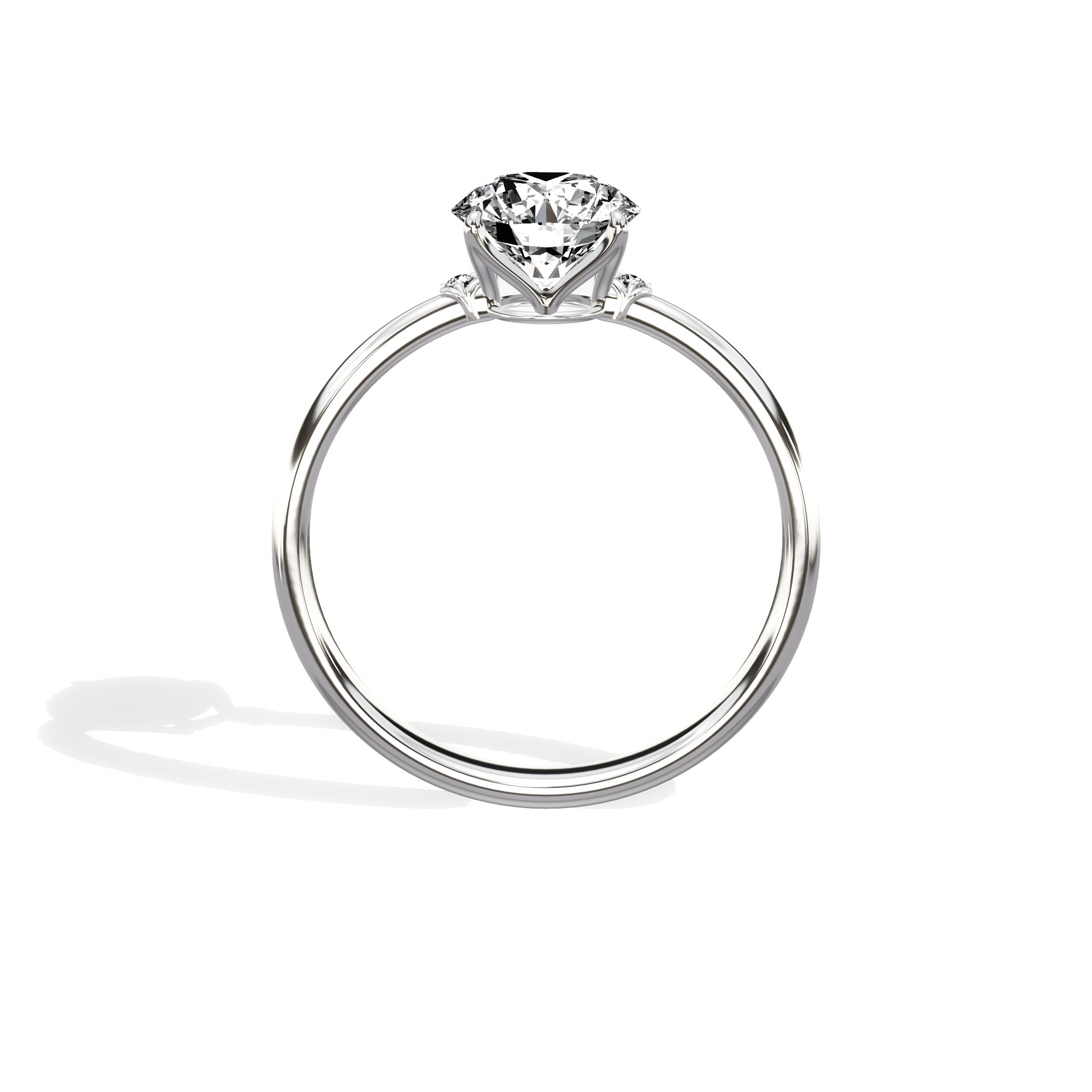 Capture the essence of timeless romance with our European Solitaire Round Engagement Ring in White Gold. This exquisite piece seamlessly blends European design with modern simplicity, creating a stunning symbol of everlasting love. At the heart of the ring, a dazzling diamond takes center stage, while two smaller diamonds are delicately embraced by intricate gold detailing on the ring shoulders, adding a touch of individuality to this elegant piece. Embrace tradition while making it your own with this captivating engagement ring.