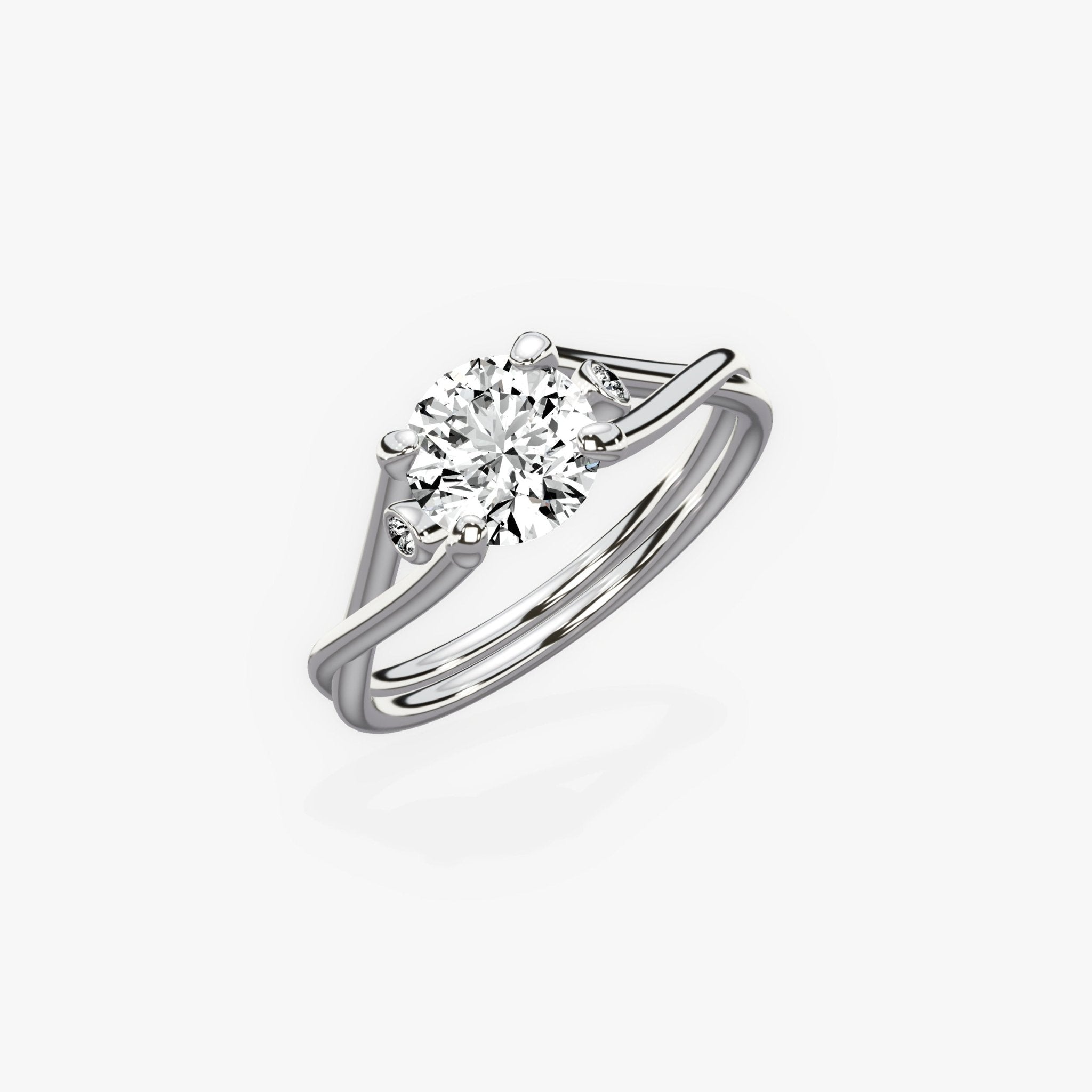 Celebrate the start of your intertwined journey with the Twisted Band Solitaire Round Engagement Ring in White Gold. This elegant ring features a double shank design, symbolizing the coming together of two individuals. The irresistibly sparkly center diamond is showcased on an open profile ring gallery, while two bezel set diamonds adorn the ring shoulders, adding an extra touch of sparkle and romance. The delicate design of this ring takes it to new heights of spectacular, making it the perfect symbol of your love and commitment.Embrace the unique beauty of this stunning ring as you embark on this new chapter in your lives together.